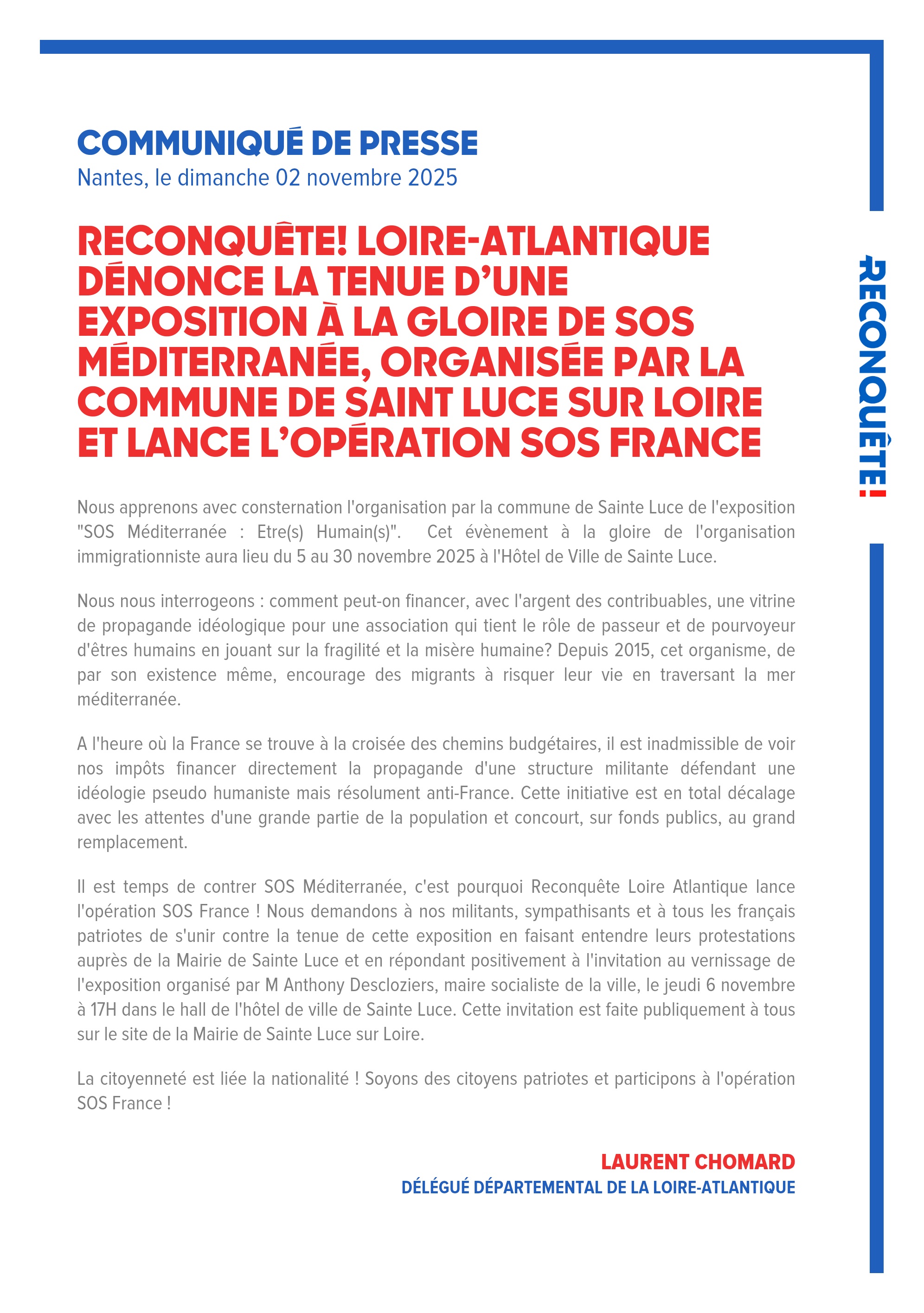 Il est temps de contrer SOS Méditerranée, c'est pourquoi Reconquête Loire Atlantique lance l'opération SOS France ! Nous demandons à nos militants, sympathisants et à tous les français patriotes de s'unir contre la tenue de cette exposition en faisant entendre leurs protestations auprès de la Mairie de Sainte Luce et en répondant positivement à l'invitation au vernissage de l'exposition organisé par M Anthony Descloziers, maire socialiste de la ville, le jeudi 6 novembre à 17H dans le hall de l'hôtel de ville de Sainte Luce. Cette invitation est faite publiquement à tous sur le site de la Mairie de Sainte Luce sur Loire.